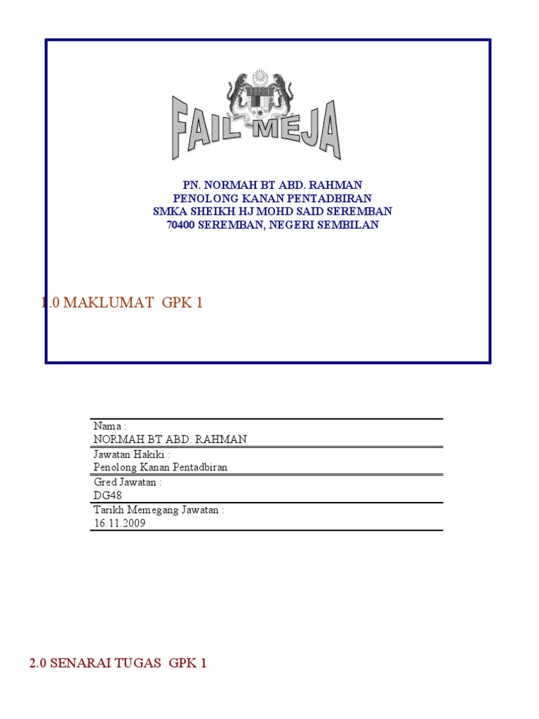 Fail meja pk from image.slidesharecdn.com Fail meja ini perlu dikaji & dikemaskini oleh ketua jabatan jika: Pelan kecemasan dan kebakaran pengetua kaunselor s/u kemasukan & pendaftaran pk hem semua penyelaras tingkatan semua guru tingkatan pk kokurikulum penolong kanan pentadbiran pk petang. Arahan kepada pegawai pentadbiran, pengurusan dan anggota kumpulan pelaksana (akp) kpm yang berada di kampung sepanjang tempoh pkp untuk kembali ke kediaman dan tempat bertugas. Tuan haji mohd shukri bin haji ghazali penolong kanan pentadbiran sk kampong kedah, parit buntar. Selaras dengan keperluan ini, fail meja dijenamakan semula sebagai myportfolio bagi memberikan gambaran menyeluruh terhadap bidang tugas serta tanggungjawab sesuatu jawatan dan agensi. Catatan dari meja pk kurikulum. Fail meja penolong kanan kurikulum. Panduan kepada guru yang memegang cerita fail meja ni bermula pada tahun 1991 dengan adanya pekeliling kemajuan pentadbiran awam (pkpa) bilangan 8 tahun 1991: